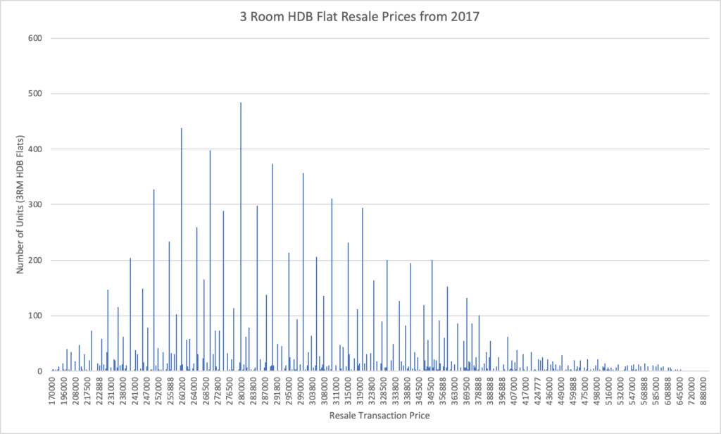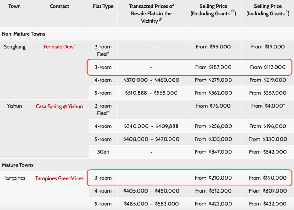 It helped us decide that we would definitely not be looking at private properties, and even amongst HDB flats, we would only be looking at 3 room flats. These tend to start in the ball park of S$180,000 both new (as seen below) and from the resale market.